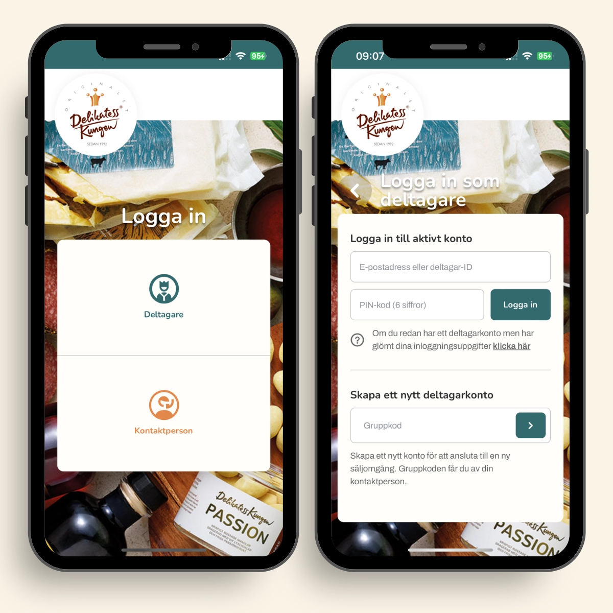 Om du vill logga in på en annan telefon med samma konto, fyller du i Deltagar-ID och PIN-kod (som du får på mejl när du registrerar dig). Varje deltagare ska bara registrera sig en gång med gruppkoden.