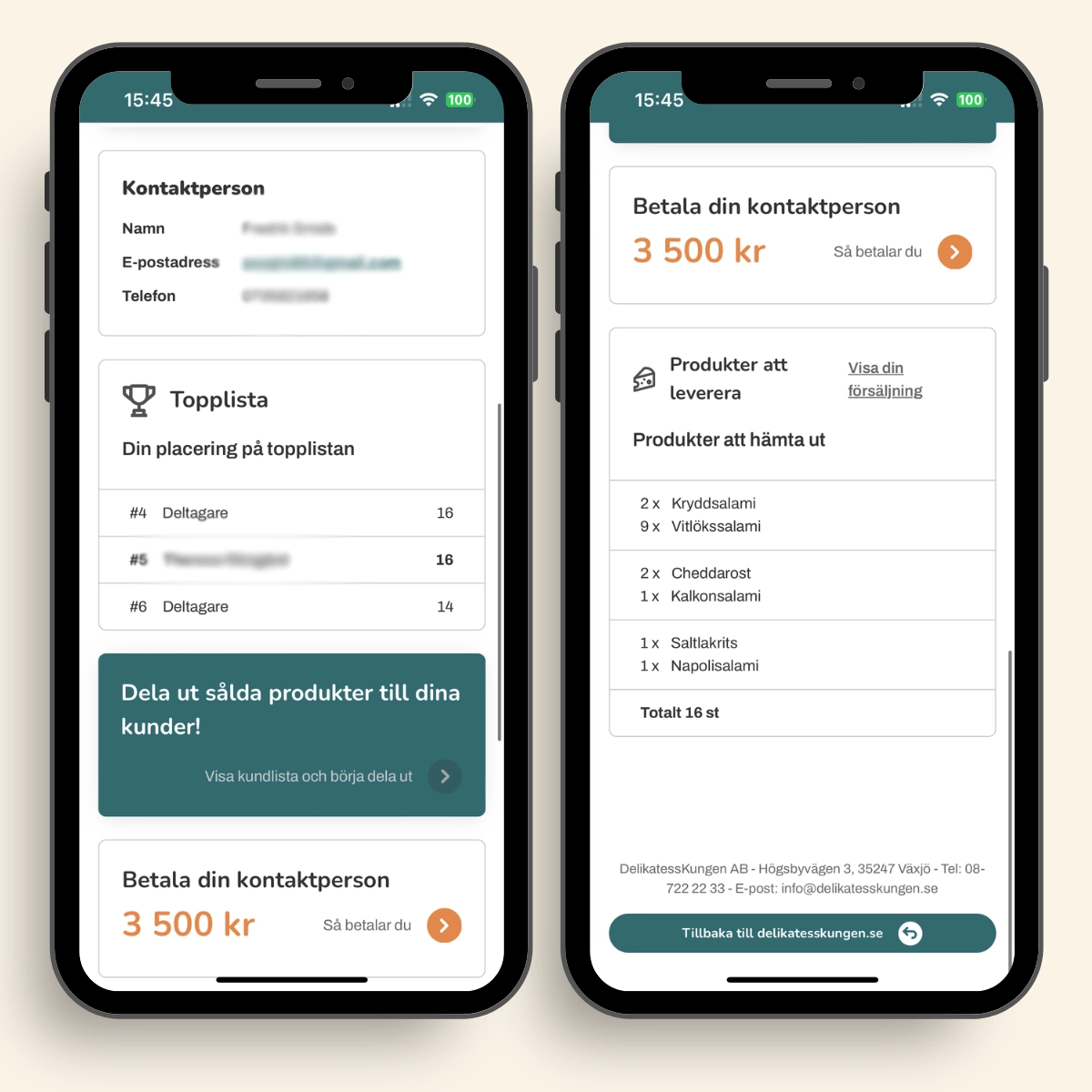 På startsidan ser du en överblick hur försäljningen ligger till. Du kan enkelt se hur många produkter du har sålt och hur många produkter hela gruppen har sålt. Om kontaktpersonen har lagt till ett försäljningsmål syns även målet här. Då kan du följa försäljningen och se när ni kommer närmare målet.