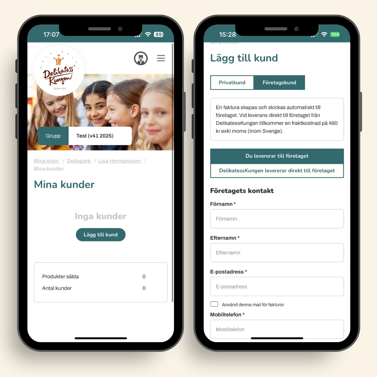 Du kan också lägga till företagsbeställningar under ”Ny kund”. Välj att kunden är ett företag och fyll i företagsuppgifter. Vi, DelikatessKungen, skickar en faktura till företaget. Du ska inte ta betalt av företaget.